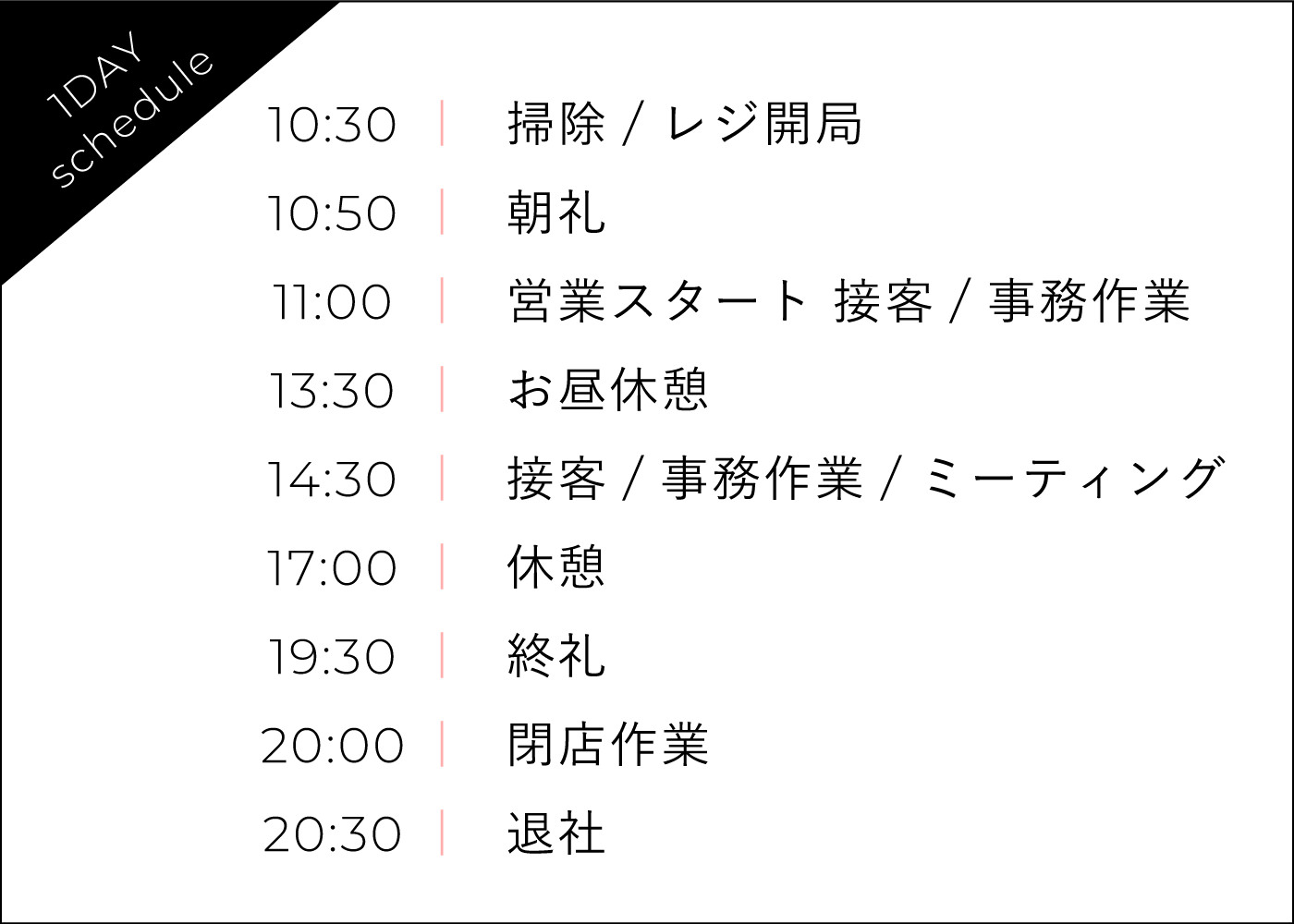 採用:店舗でのお仕事についてお伺いできればと思います。1日のお仕事の流れを教えていただけますでしょうか。